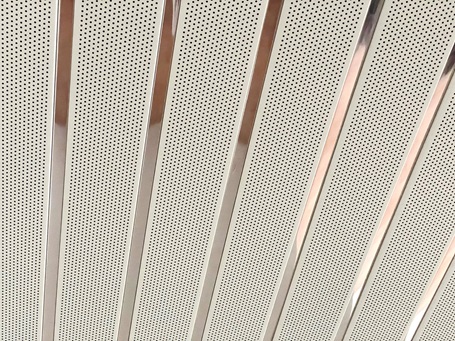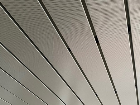 Kolorowe aluminiowe panele sufitowe do podwieszanych sufitów metalowych z otwartymi złączami są dostępne z perforowaną lub nieperforowaną, gładką powierzchnią. Na życzenie klienta perforowane panele sufitowe mogą być produkowane fabrycznie z włókniną akustyczną z tyłu. Długość paneli sufitowych jest zmienna (maksymalnie do 6,00 m) i jest wykonywana zgodnie z Państwa życzeniem. Na zamówienie profile wypełniające (spoiny) mogą być wykonane w różnych kolorach dla sufitów panelowych.