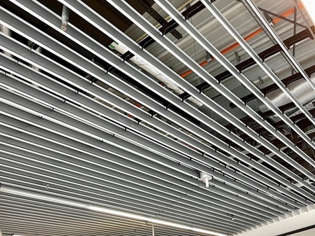 Sufity podwieszane pionowe listwowe wykonane z jasnego aluminium